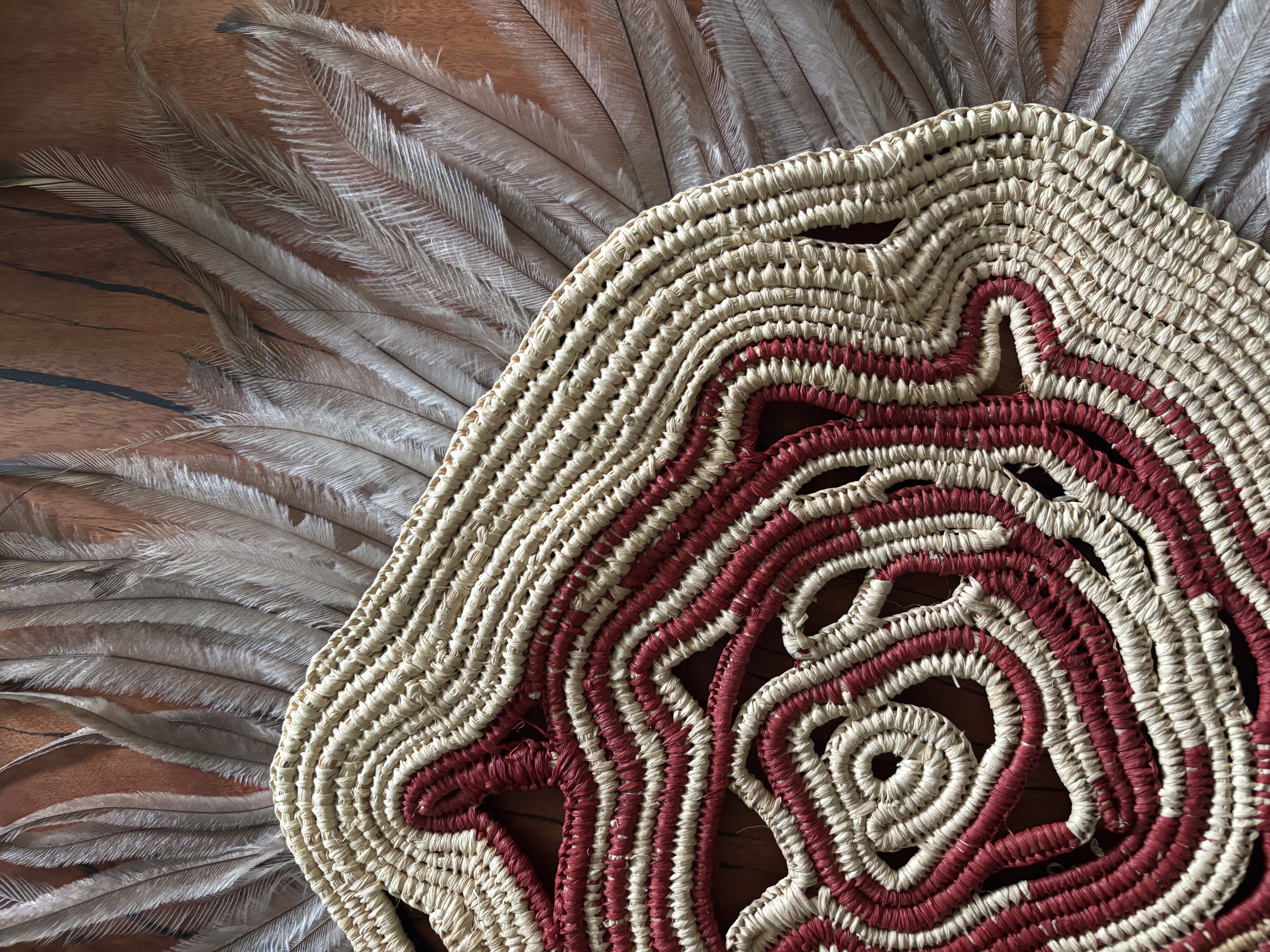 Image: BECKY CHATFIELD Maaruma-li (Heal) (detail) 2025, woven raffia and Dinawan Wirrriil (emu feathers)
